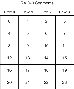 The individual segments in a 4-wide RAID-0 array are organized as follows:
