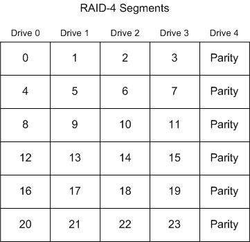 The individual segments in a 4+1 RAID-4 array are organized as follows: