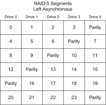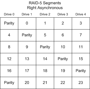 In this layout, the segments are numbered sequentially, starting with the first drive in the stripe after the parity. The segments wrap. The parity drive starts at the right-most drive, and moves left one drive per stripe.
