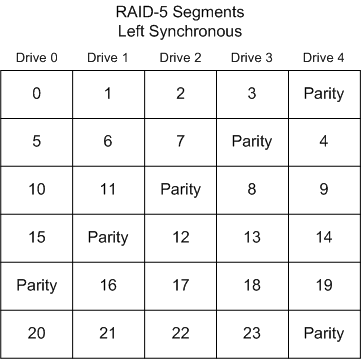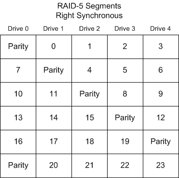 In this layout, the segments are numbered sequentially, starting with the first non-parity drive in the stripe. The parity drive starts at the left-most drive, and moves right one drive per stripe. This is the 'standard' RAID-5 layout. It is not the default for Linux.